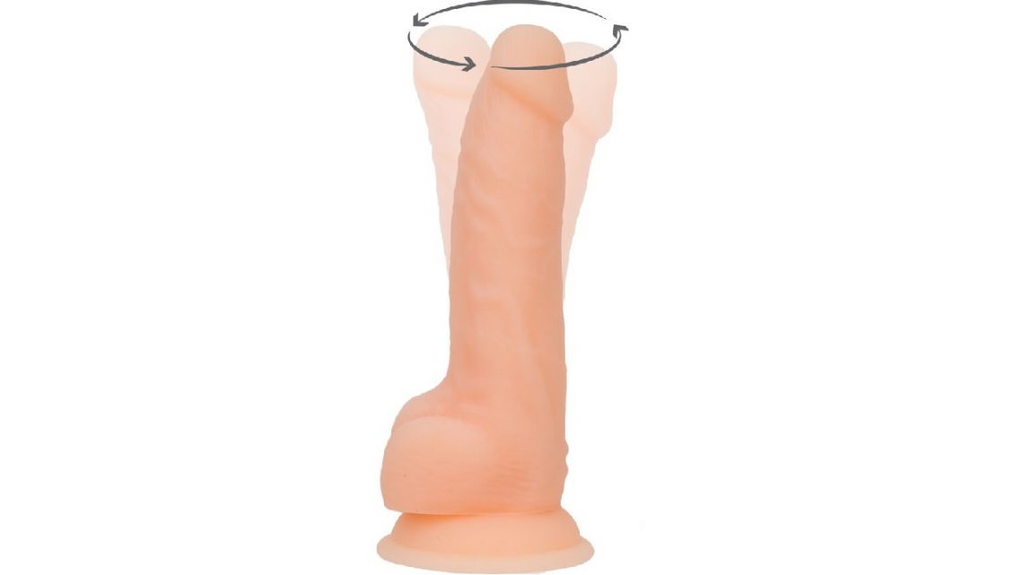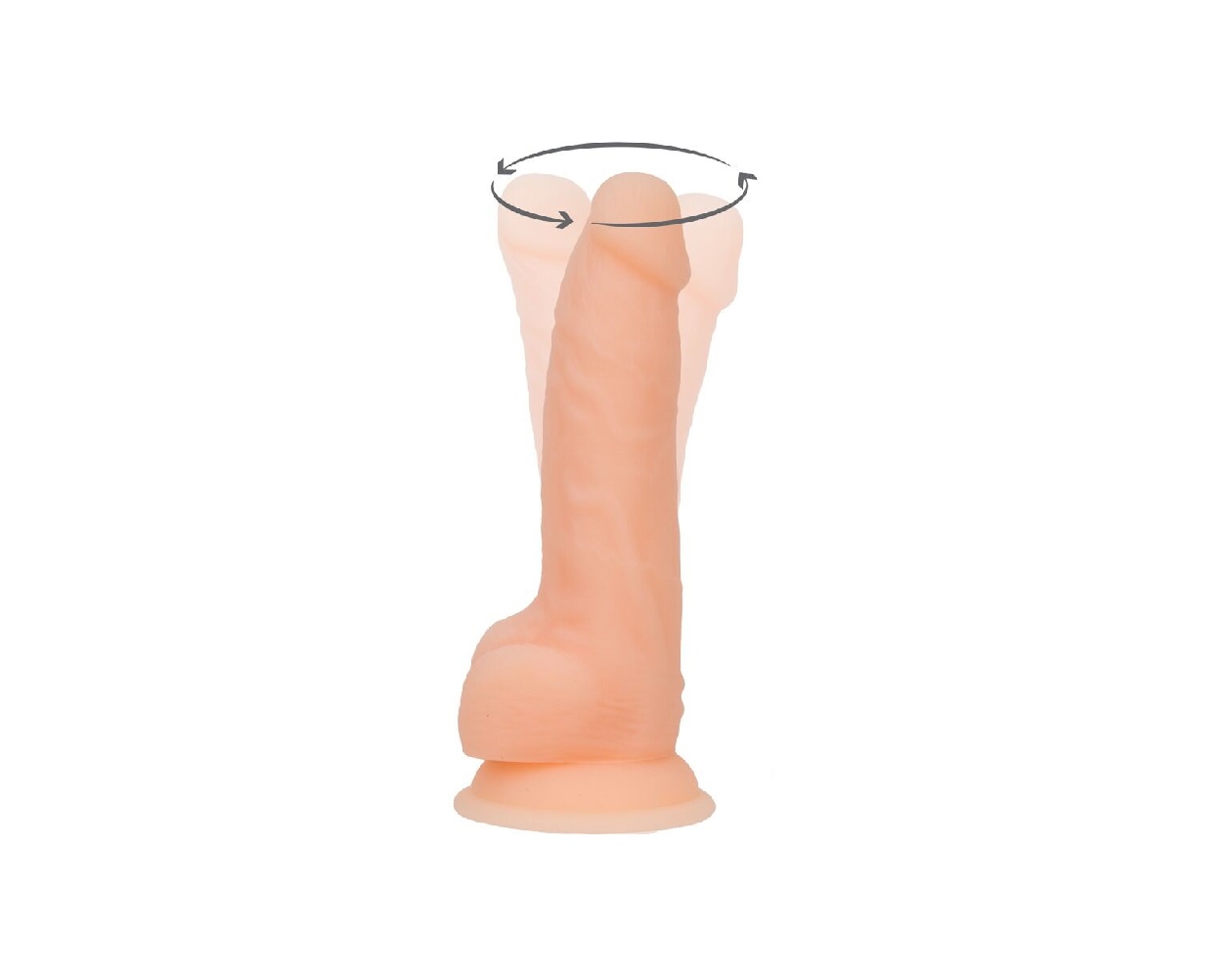 Vibrador natural flexible de 8″ Dong giratorio y vibratorio de Naked Addiction con apariencia de pene realista con venas finas y glande abultado. Con base de succión debajo de los testículos antideslizantes, que se adhiere firme y segura a cualquier superficie lisa y permite así disfrutar del placer con las manos libres. Compatible con correas y arneses.