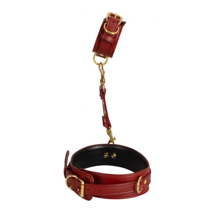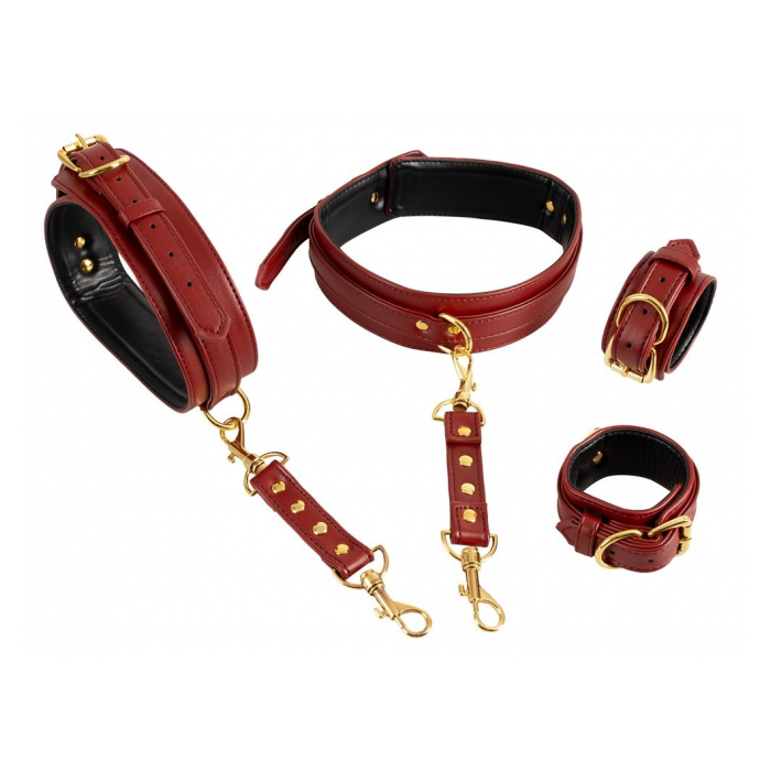 Sujeciones combinadas para manos y muslos fabricadas en polipiel roja muy suave con elementos metálicos en color dorado, de elegante acabado.