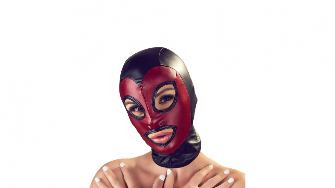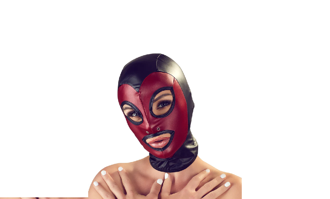 Máscara para la cabeza muy elástica que se ajusta perfectamente a la piel. Negra por todos lados con campo de visión rojo. Con grandes aberturas negras con ribetes sobre los ojos y la boca, y ojales para las fosas nasales. Talla única: se adapta tanto a él como a ti.