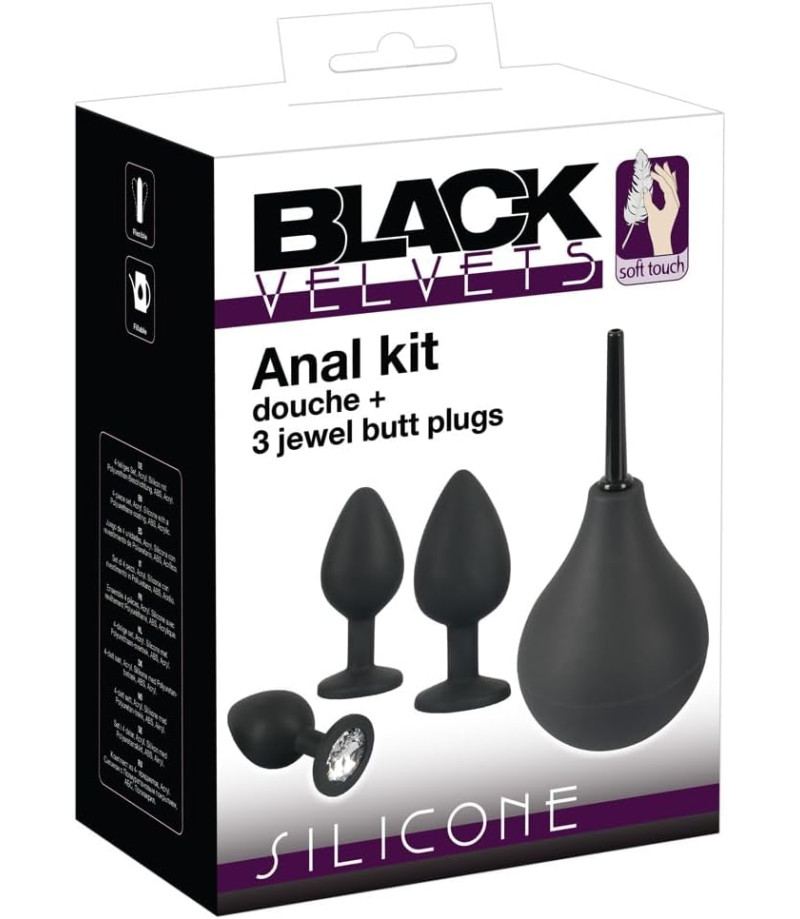 3 x plug anal en diferentes tamaños para un entrenamiento de estiramiento perfecto y cada uno con piedras preciosas en la base para una apariencia excitante en la trastienda.