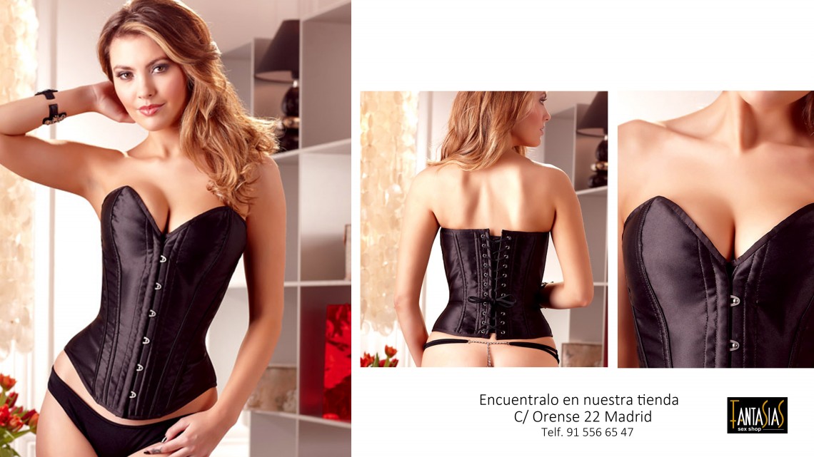 Negro, corsé de satén 4 capas con conexión para elementos de fijación en la parte delantera y el material negro debajo de la lazada en la espalda. 10 huesos de acero en espiral integradas en total. 100% poliester. Forro interior: 100% algodón. Sin escritos.