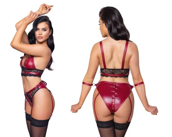 Braguita tipo bralette y liguero de Cottelli BONDAGE confeccionada en un precioso tejido de aspecto rojo mate con delicadas inserciones de encaje negro y elementos metálicos de color plateado.