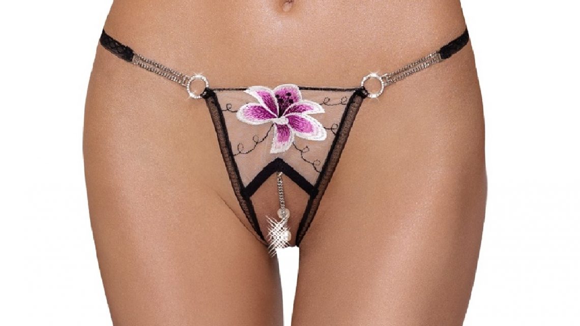Tanga Rio ouvert de Cottelli Lencería confeccionada en fina red de tul con hermosas flores y delicados bordados en el seductor frente abierto.