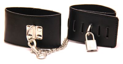 Esposas de polipiel con tamaño regulable. Incorporan un candado a modo de cierre.