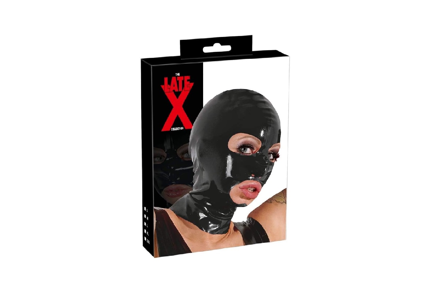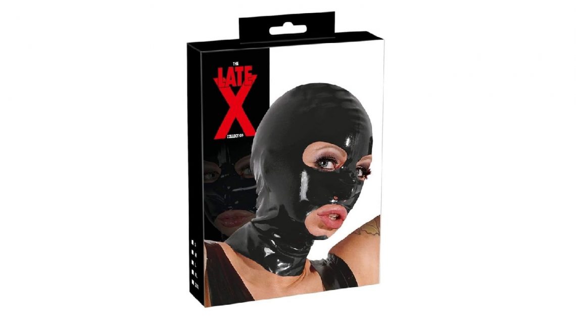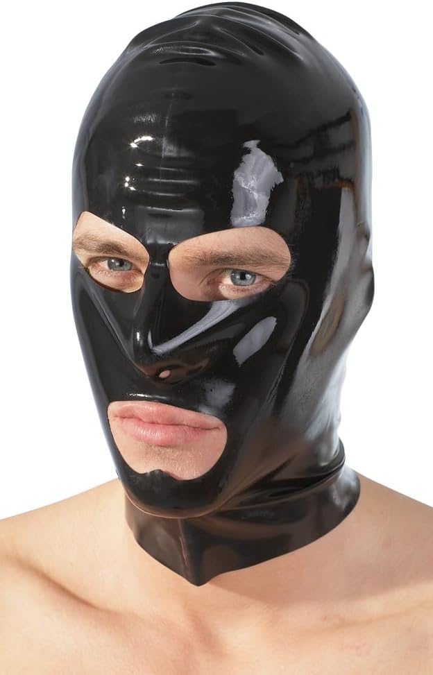 Descripción Máscara de látex negra con orificios para ojos, boca y fosas nasales. Revestimiento plano. Látex (fabricado a partir de látex de caucho natural que puede provocar alergias).