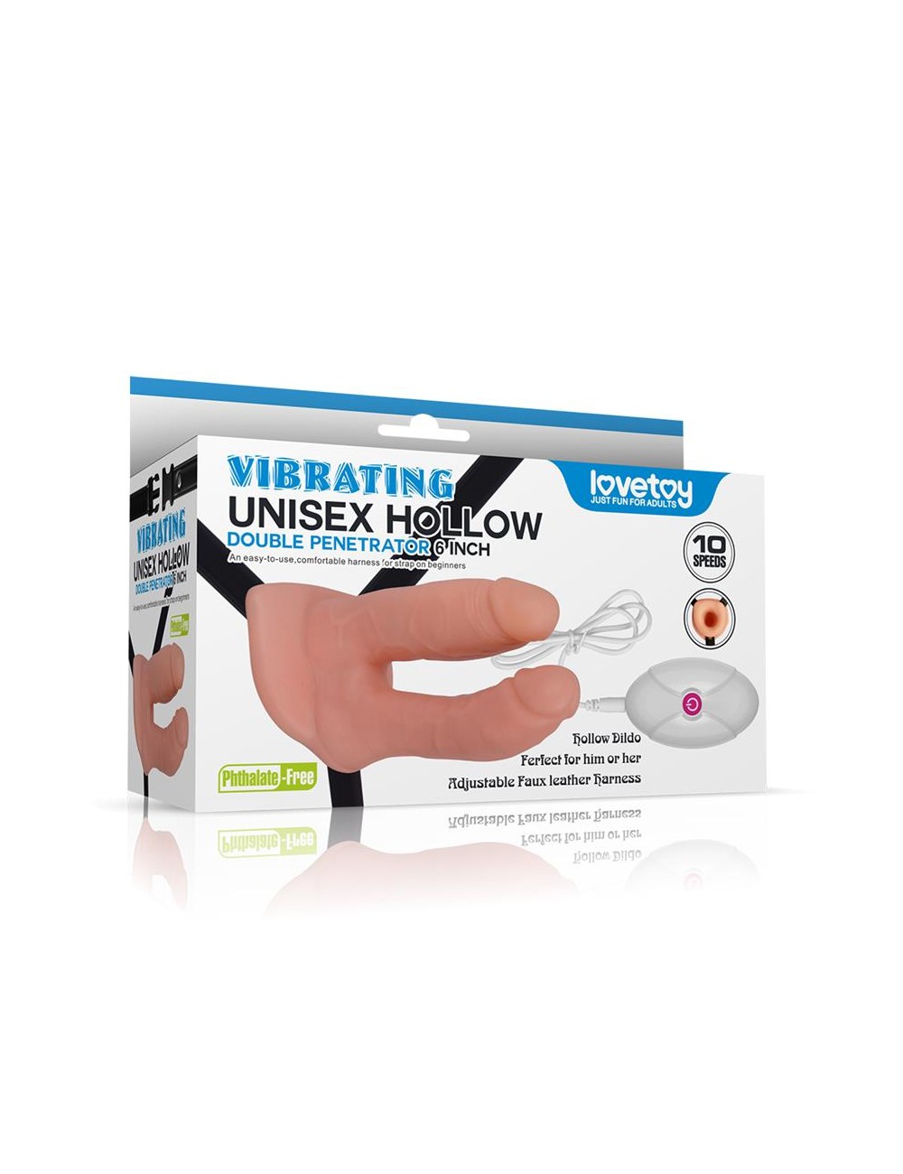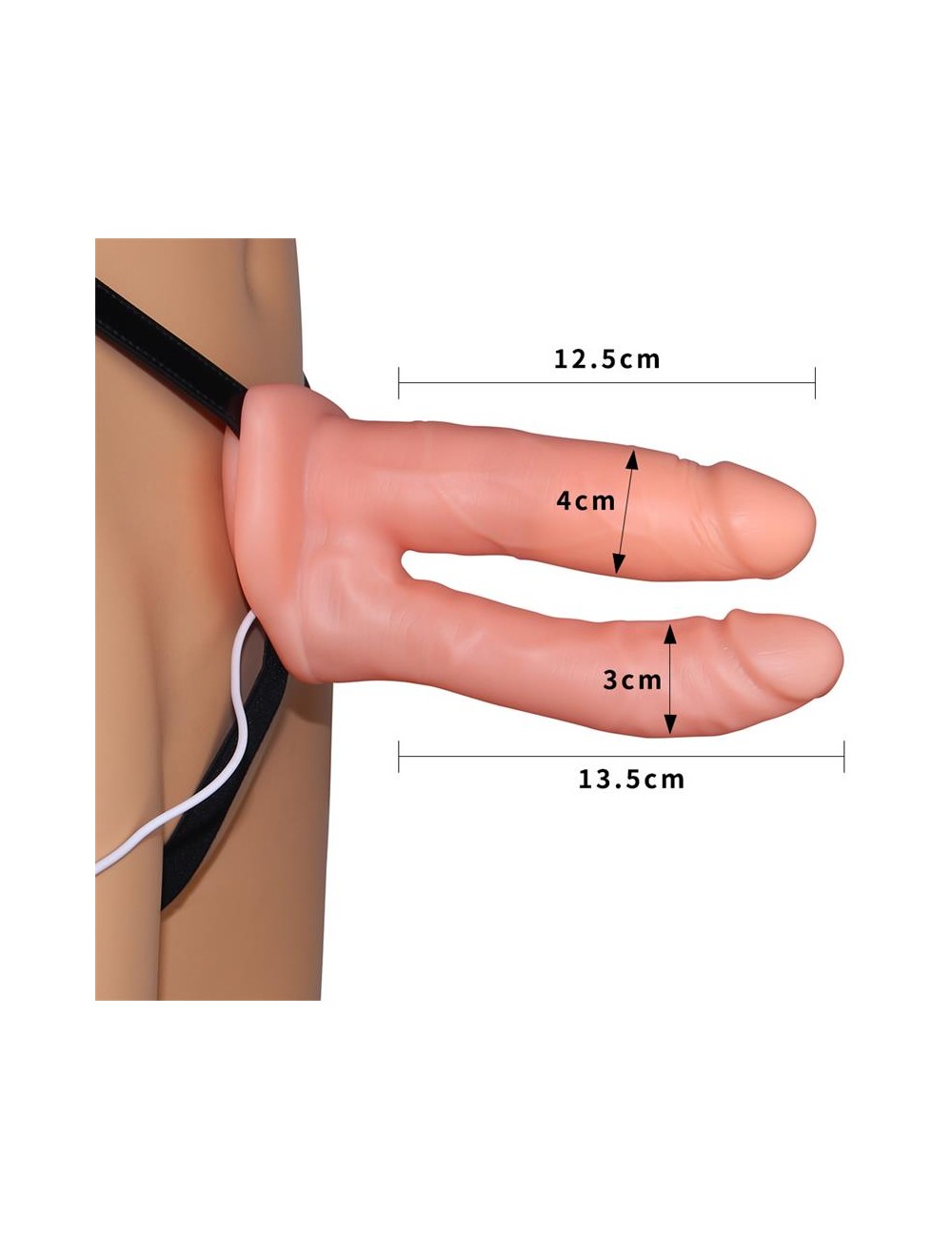 Arnés de doble pene hueco con vibración de 15.24 cm para él o para ella.