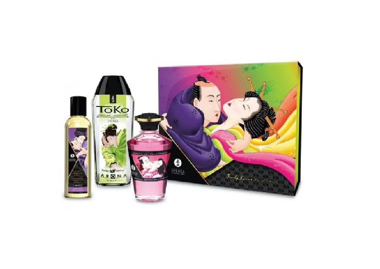 Kit compuesto con un aceite de masaje erótico libido de frutos exóticos, aceite afrodisíaco de frambuesa, lubricante de sabor con aroma de melón y mango.