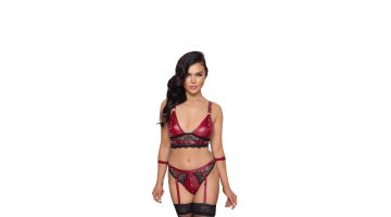 ¡Un conjunto de encaje lleno de atracción concentrada! Bralette, liguero y braga sin entrepierna combinados en este conjunto de Abierta Fina. Todo está hecho de …