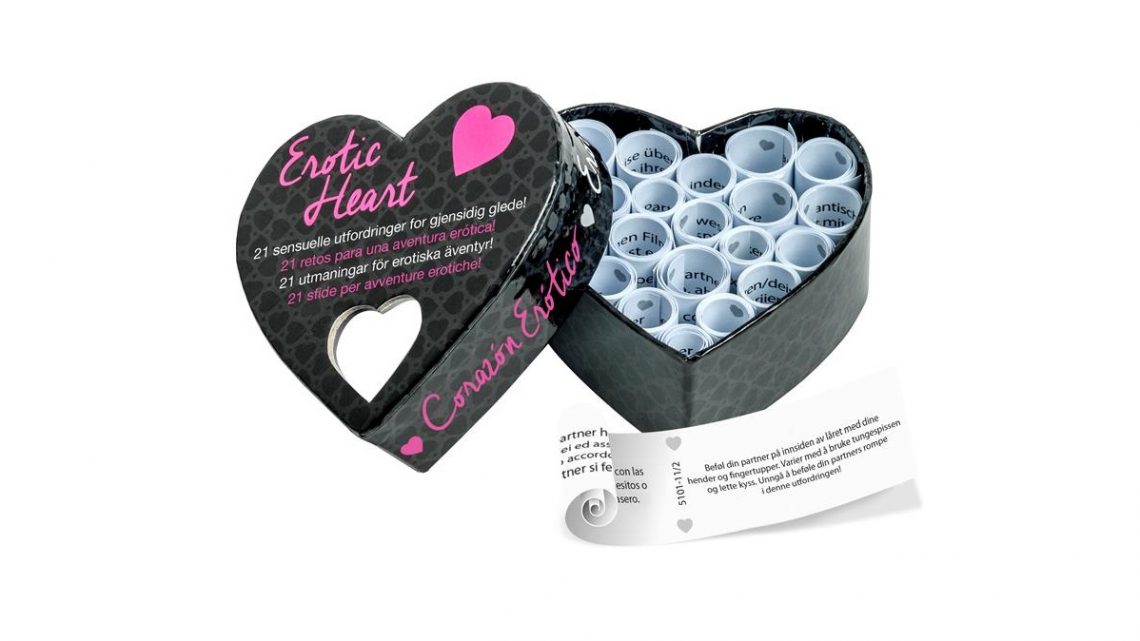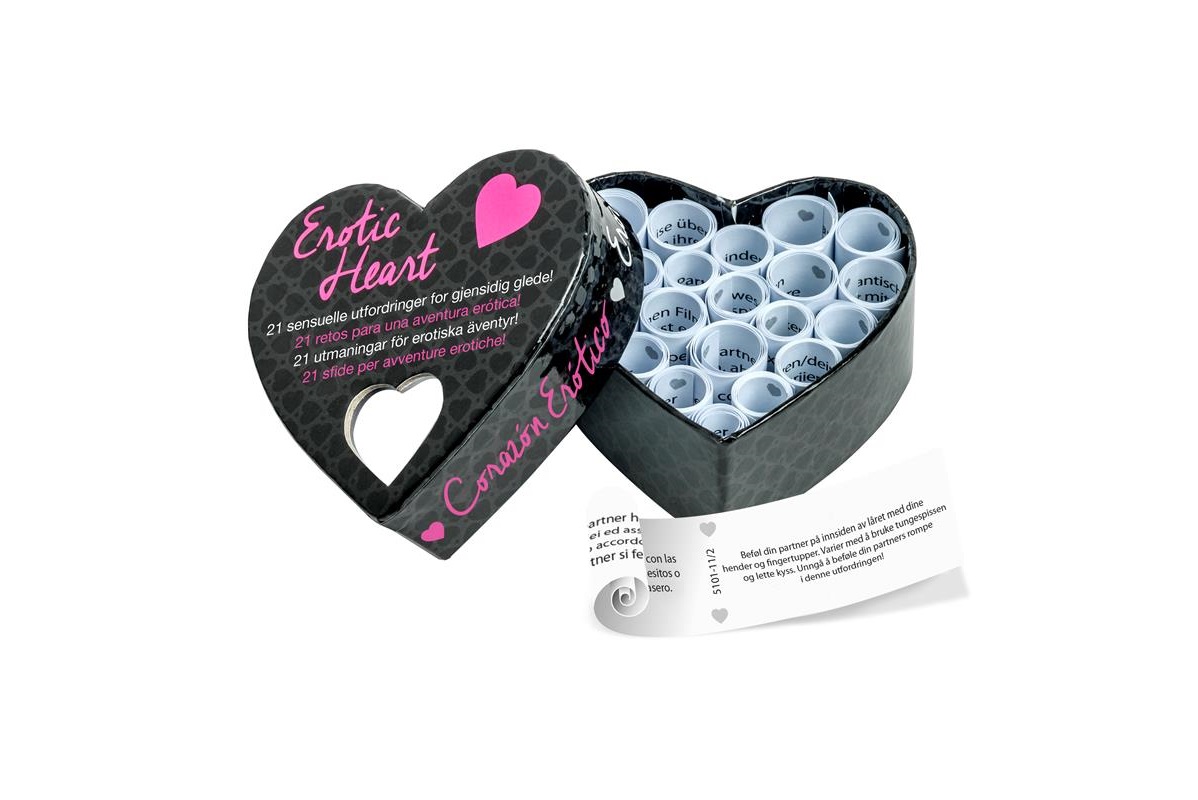 The Erotic Heart es una caja en forma de corazón que contiene veintiún invitaciones desafiantes para ti y tu pareja. Midiendo menos de tres pulgadas de ancho, este pequeño corazón puede aparecer en cualquier lugar. Debajo de una almohada, en una cesta de picnic, con una copa de vino o durante una cena romántica para dos: añade emoción y aventúrate cada vez que te apetezca.