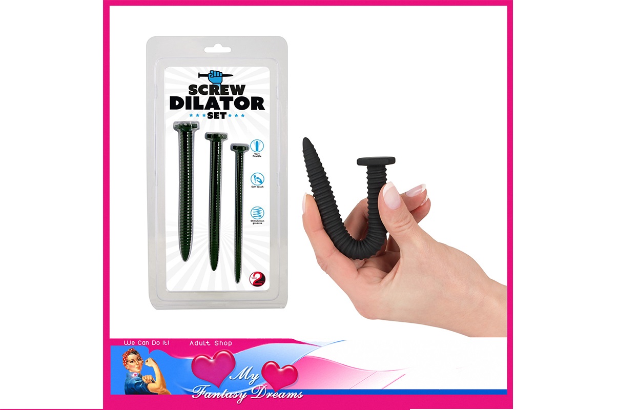 3 dilatadores extremadamente largos que están diseñados como tornillos en diferentes tamaños y con diferentes pesos. Perfecto para principiantes y expertos en estiramiento uretral.